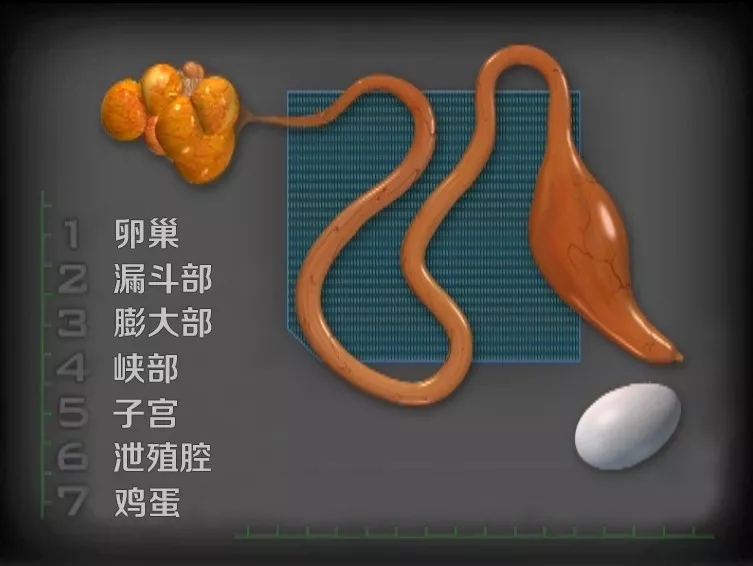 蛋雞的生殖系統(tǒng)稱為輸卵管,包括卵巢、漏斗部、膨大部、峽部、子宮、泄殖腔。大多物種的雌性動物具有左右兩條輸卵管,但鳥類只發(fā)育了左邊那條,長約2英尺(60厘米)。